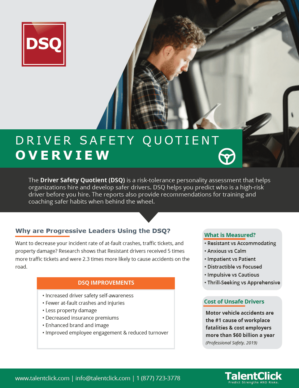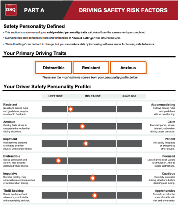 This online employee safety assessment provides employers and their drivers with valuable insight into their natural driving styles. The DSQ measures 6 Personality Dimensions that have been linked to unsafe behaviors which can lead to incidents and injuries on the road and in the workplace: