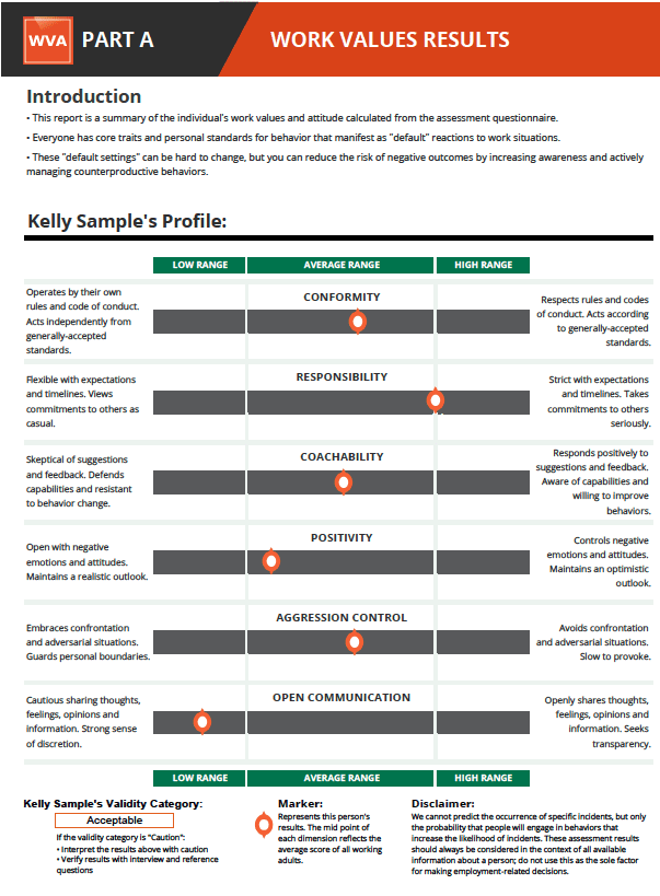The Work Values & Attitude (WVA) assessment helps employers and managers understand how people will “fit” to roles and corporate values and attitudes by providing a preview of an individual’s natural work values and default settings in these key areas: